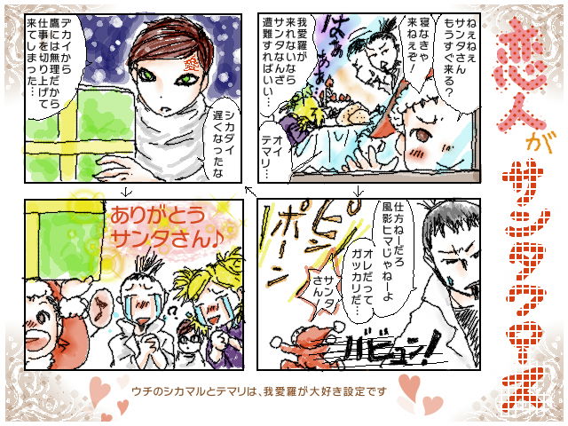 ・・・実のところ、我愛羅は不幸な幼少時代を送ってきてるので、子育てには相当な困難が予想される(と、勝手に思ってるだけ…)ので、勝手に胸が痛いんですけどね…
