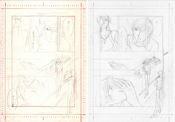 コンテ切った用紙にそのまま下書き(画像右側)