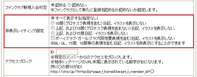 ここで設定を行うことにより、レイティングの内容をもとに一部のイラストや日記を非表示にすることができるようになっています。