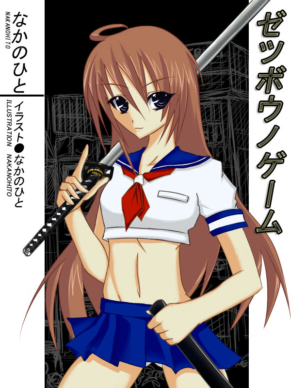 制服姿のまま肩から紐を通し、小振りの日本刀を背負う。