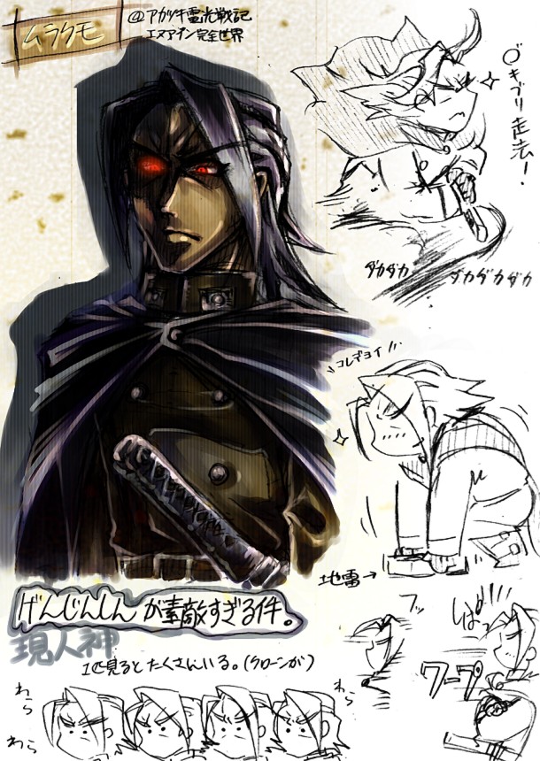 で、一目ぼれして、0.2秒で持ちキャラ決定したのが、イラストのこの方。ラスボス、軍装(というか旧日本陸軍軍人)、日本刀、オールバック系の渋い髪型、世界征服系(この人の場合は全人類粛清)理念持ち……挙句に、マジキチ、イロモノ、キワモノと。なにこの俺の萌え属性を須く完備した萌えキャラは。オマケに絵が(全体的に)レトロで暗くて硬派で、滅茶苦茶好みです。お前は神か!…と思っていたら、『現人神』でした。ちなみに、「げんじんしん」と読む。(※担当声優さんの読み間違えから。キャラのイロモノさも手伝って、仇名はすっかり「げんじんしん」。)