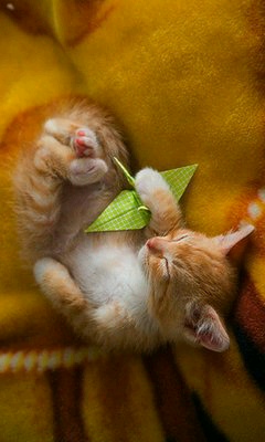 折り鶴と猫ちゃん♪ …遊び疲れて猫ちゃんのお宝、折り鶴と睡眠中♪ 足もピタッと合わせて(笑) もう少し寝かしてあげてくださいにゃ♪
