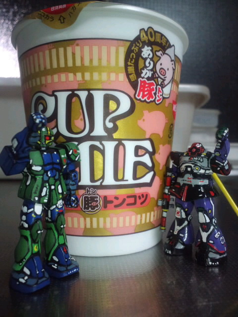 日清ありが豚骨ラーメン♪ …日清の新しい味発見! 豚骨味♪ 食してみたところ~もうちょっとインパクトが欲しいかな~という味〔個人的に〕 シーフード味の薄めな感じ? 豚骨味はスーパーカップのほうがお気に入り!あっ言っちゃった…(笑) …といっているガンチョコな2人〔旧ザク君とドムッチ〕