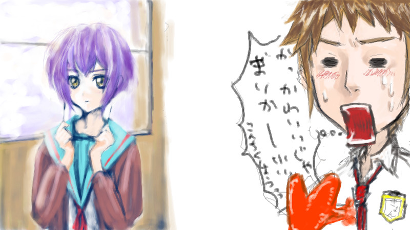 絵チャにて。 つか、まさか長門にリク入ると思わな かった。 てっきり筋肉描かされるものとばかr さす がKWMTさんだ、侮れない!隣のキョンも最高だ!