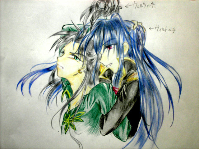 ヴィルト:銀髪、緑の服 ウェルツ:青髪、黒い服