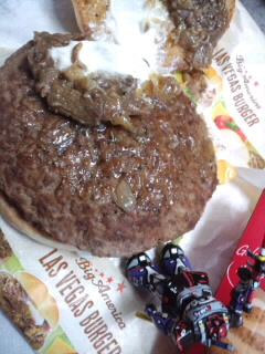 ラスベガスバーガーとドム君♪ …マクドナルドの☆ラス ベガスバーガー☆食べてみました~感想→コンビニの牛 丼の肉といつもバーガー肉をマヨネーズかけて食べた