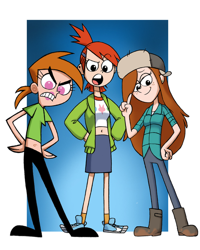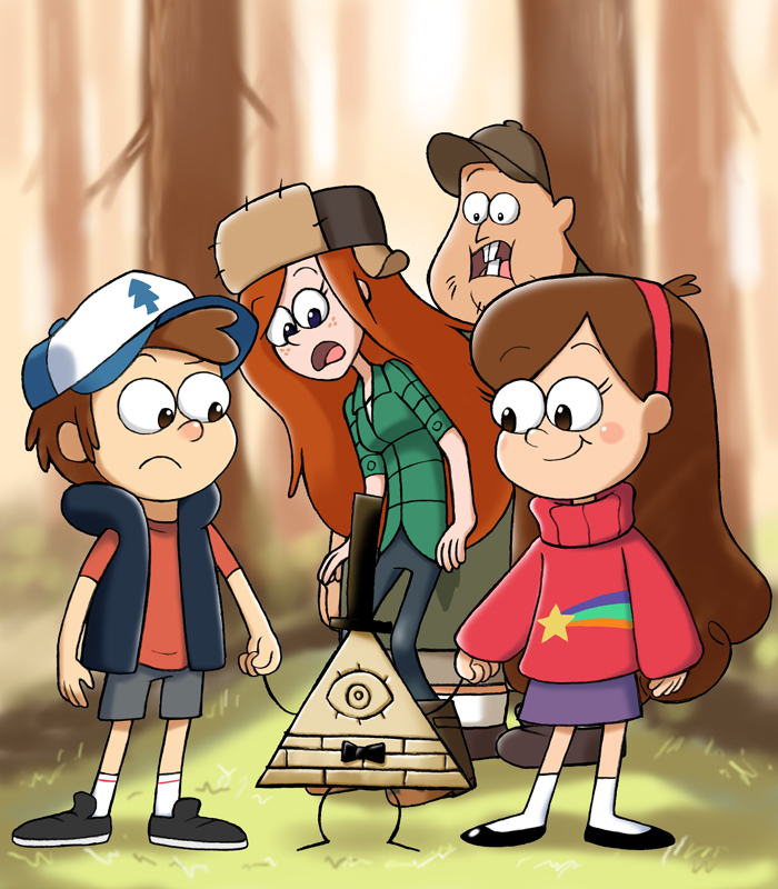Gravity Falls。 こういう場面はありません。いまの ところ。 左がディッパー。右がメイベル。 後ろが ウェンディとスース。 真ん中の変なものはなにか、