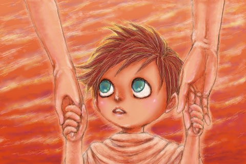 コレの前に、幼少な砂の3姉弟が絵本を覗き込んでる