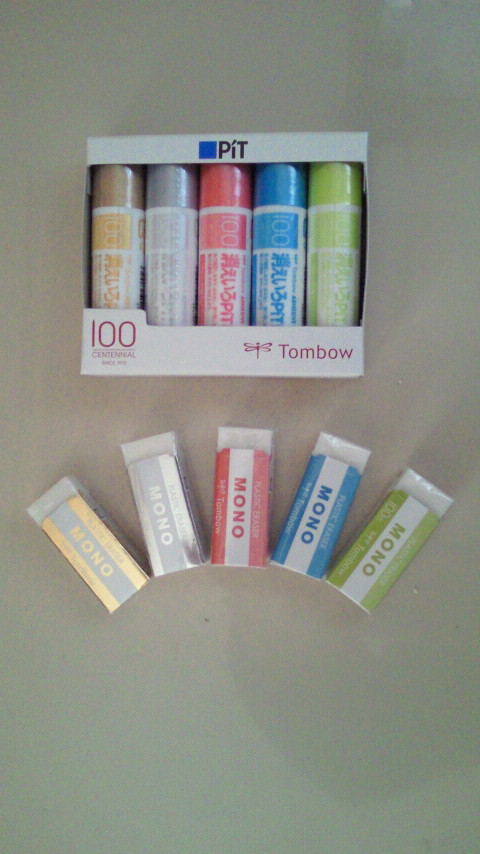 昨年秋に、トンボ鉛筆創立100周年を記念して発売 された、 「MONO消しゴム」と「消えいろPIT」の限 定カラー5色組。 気がついた時には既に文房具屋に